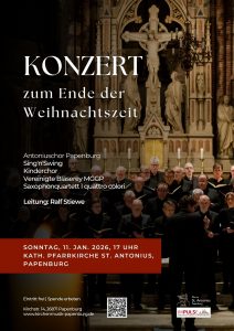 Das traditionelle Konzert zum Ende der Weihnachtszeit in der St.-Antonius-Kirche rundet die Weihnachtszeit musikalisch ab. Die Chöre der Pfarrei unter der Leitung von Ralf Stiewe musizieren gemeinsam mit der Vereinigten Bläserey MGGP. Ein kurzweiliges und stimmungsvolles Programm mit Weihnachtsliedern zum Mitsingen lässt das Weihnachtsfest noch einmal nachklingen.