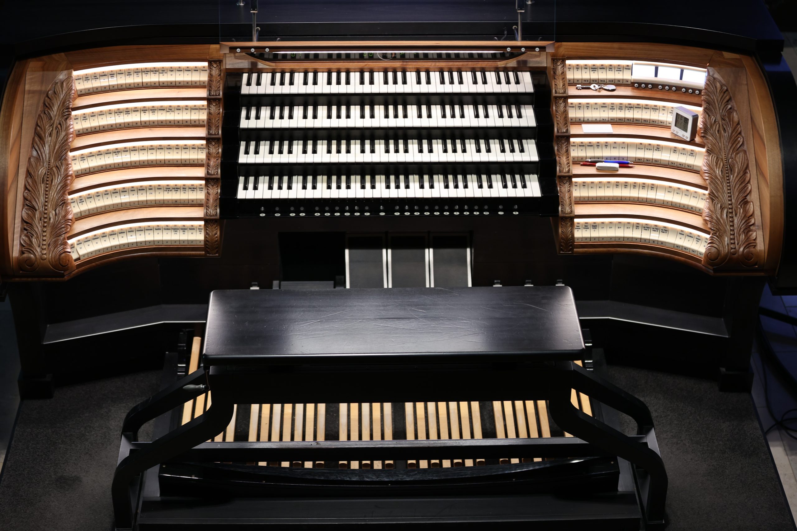 Der neue Spieltisch ist fahrbar und kann an drei Anschlussstellen mit der Orgel verbunden werden. Die rechnergesteuerte Ansteuerung geschieht über Glasfaser. Je nach Anlass kann der Spieltisch ganz vorne, mittig am Taufbecken, seitlich an der Chororgel oder hinten nahe der großen Orgel aufgestellt werden. Er zitiert in seiner Ästhetik historische Walcker-Spieltische der 1910-er und 1920-er Jahre.