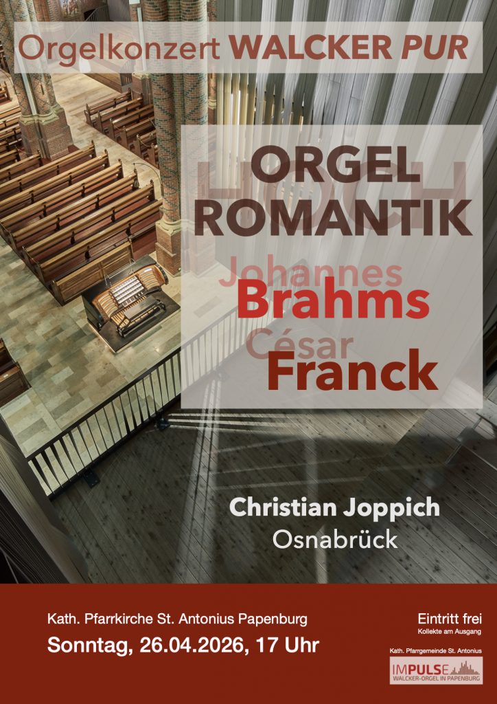 Am Sonntag, den 26. April 2026, konzertiert um 17 Uhr Christian Joppich aus Osnabrück im Rahmen der Konzertreihe WALCKER PUR mit Werken von Brahms und Franck an der historischen Walcker-Orgel in der St.-Antonius-Kirche in Papenburg.